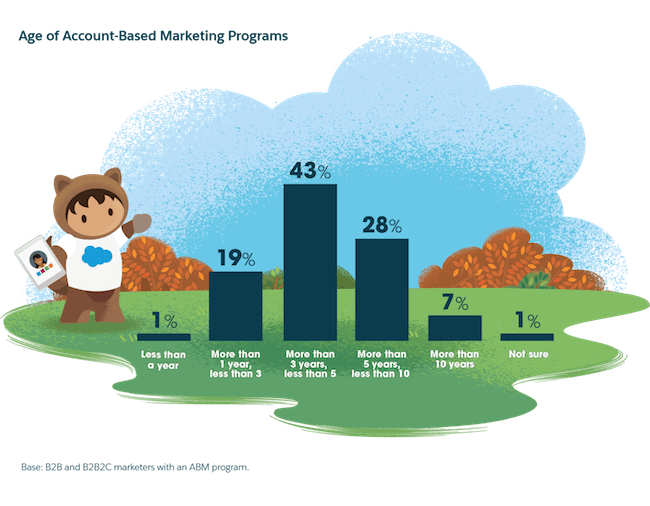 92% các nhà tiếp thị B2B hiện có chương trình ABM. ABM là một chiến lược tăng trưởng tập trung, trong đó tiếp thị và bán hàng cùng hợp tác để tạo ra một trải nghiệm mua hàng được cá nhân hóa cho một nhóm tài khoản có giá trị cao.