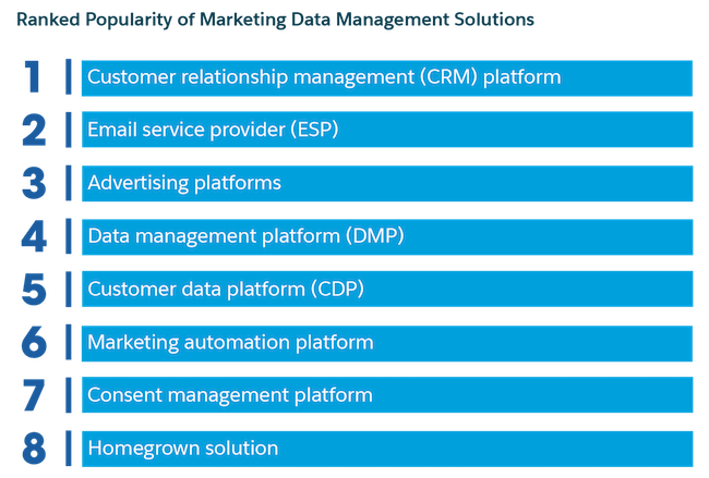 78% các nhà tiếp thị mô tả mức độ tương tác với khách hàng dựa trên dữ liệu. Họ đang dần chuyển sang vô số nguồn dữ liệu khách hàng. Khi nguồn dữ liệu có sẵn tăng lên, số lượng nền tảng quản lý dữ liệu cũng tăng theo. Vào năm 2018, các nhà tiếp thị sử dụng trung bình 3 công cụ quản lý dữ liệu, đến năm 2020 con số này đã tăng lên 6. Điều này khiến các nhà tiếp thị đưa việc hợp nhất và kích hoạt dữ liệu thành thách thức hàng đầu của họ. Điều này sẽ đơn giản hơn khi sử dụng nền tảng CRM của Salesforce, mọi dữ liệu sẽ được hợp nhất trên một nền tảng duy nhất, trí tuệ nhân tạo sẽ đóng vai trò phân tích và đưa ra những chiến dịch cá nhân hóa cho từng đối tượng.